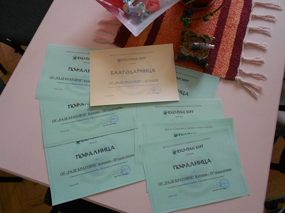 По спроведените работилници и акцијата за собирање на пластичен отпад, претставник од компанијата „Еко-Пак Хит“ од Кочани го посети ОУ „Раде Кратовче“ и на најуспешните одделенија во собирање на пластичен отпад им врачи донации. Беа доделени спортски реквизити - фудбалски топки, а сите ученици учесници во акцијата беа почестени со производи од компанијата Макпрогрес од Виница.