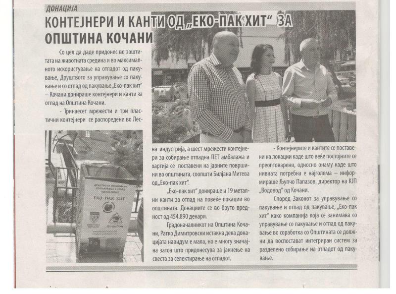 ЕКО-ПАК ХИТ ДОО Кочани дава свој придонес преку давање на донации за општина Кочани и тоа: 13 мрежести контејнери 1x1x2 м и 3 пластични контејнери 1/1 м3 кои се распределни во бизнис секторот во општината и 6 мрежести контејнери 1x1x2м распределни на јавните површини во општината наменети за собирање на ПЕТ амбалажа и хартија. Донирани се и 19 метални канти за отпад распределни на повеќе локации во општината кои се утврдени со взаемна согласност со ЕКО-ПАК ХИТ и Општина Кочани. Дадените донации се во бруто вредност од 454 890 денари.